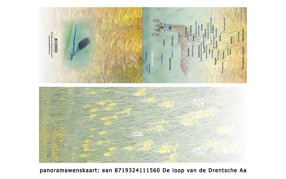 56 De loop van de drentsche Aa ean 8719324111560 2017/12/182017/12/18 | karlaleeftink Staande kaart met de hele loop van de Drentsche Aa vanaf het brongebied tot aan de Waddenzee; een reebok en stromend water als afbeelding. Binnenin gele beenbreek met orchideeën. Achterop staat een weidebeekjuffer mannetje
