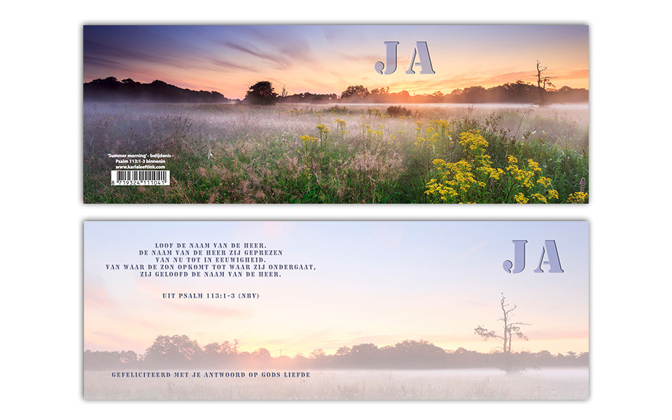Deze belijdeniskaart heeft binnenin de tekst uit Psalm 113:1-3: Loof de naam van de HEER. De naam van de HEER zij geprezen van nu tot in eeuwigheid. Van waar de zon opkomt tot waar zij ondergaat, zij geloofd de naam van de HEER. Ook staat binnenin: Gefeliciteerd met je antwoord op Gods liefde. En in grote letters zowel voorop als binnenin: JA