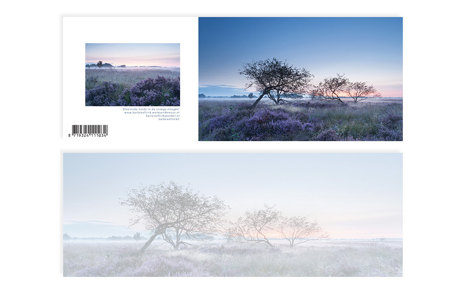 03 Bloeiende heide in de vroege morgen buitenkant en binnenkant A6 kaart A6 kaart, die naar panoramaformaat opengaat; ook de binnenzijde is bedrukt met een meer transparante en goed beschrijfbare afbeelding