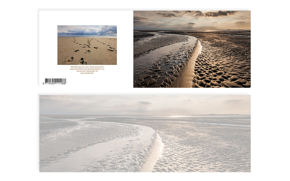 18 Waddensporen voor Rottumerplaat buitenkant en binnenkant A6 kaart A6 kaart, die naar panoramaformaat opengaat; ook de binnenzijde is bedrukt met een meer transparante en goed beschrijfbare afbeelding