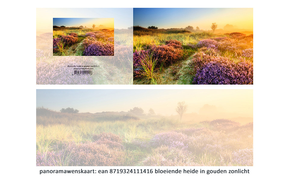 41 Bloeiende heide in gouden zonlicht ean 8719324111416 A6 kaart, die naar panoramaformaat opengaat; ook de binnenzijde is bedrukt met een meer transparante en goed beschrijfbare afbeelding