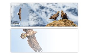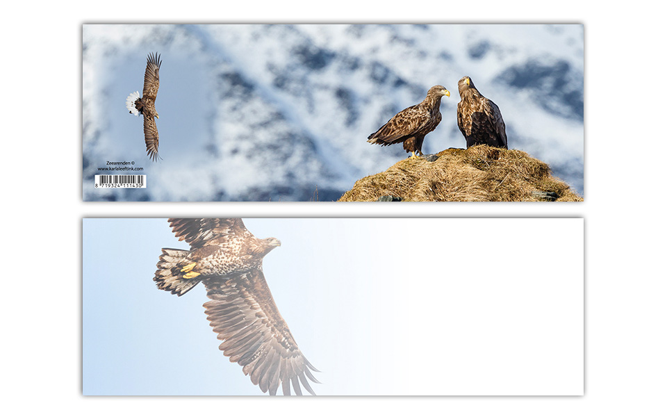 A6 kaart met zeearenden, die naar panoramaformaat opengaat; ook de binnenzijde is bedrukt met een meer transparante en goed beschrijfbare afbeelding van een zeearend vanaf de onderkant gezien