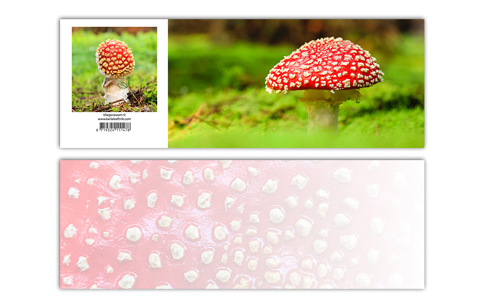 47 Vliegenzwam A6 kaart ean 8719324111478 A6 kaart met vliegenzwam, die naar panoramaformaat opengaat; ook de binnenzijde is bedrukt met een meer transparante en goed beschrijfbare afbeelding van rood-met-witte-stippen